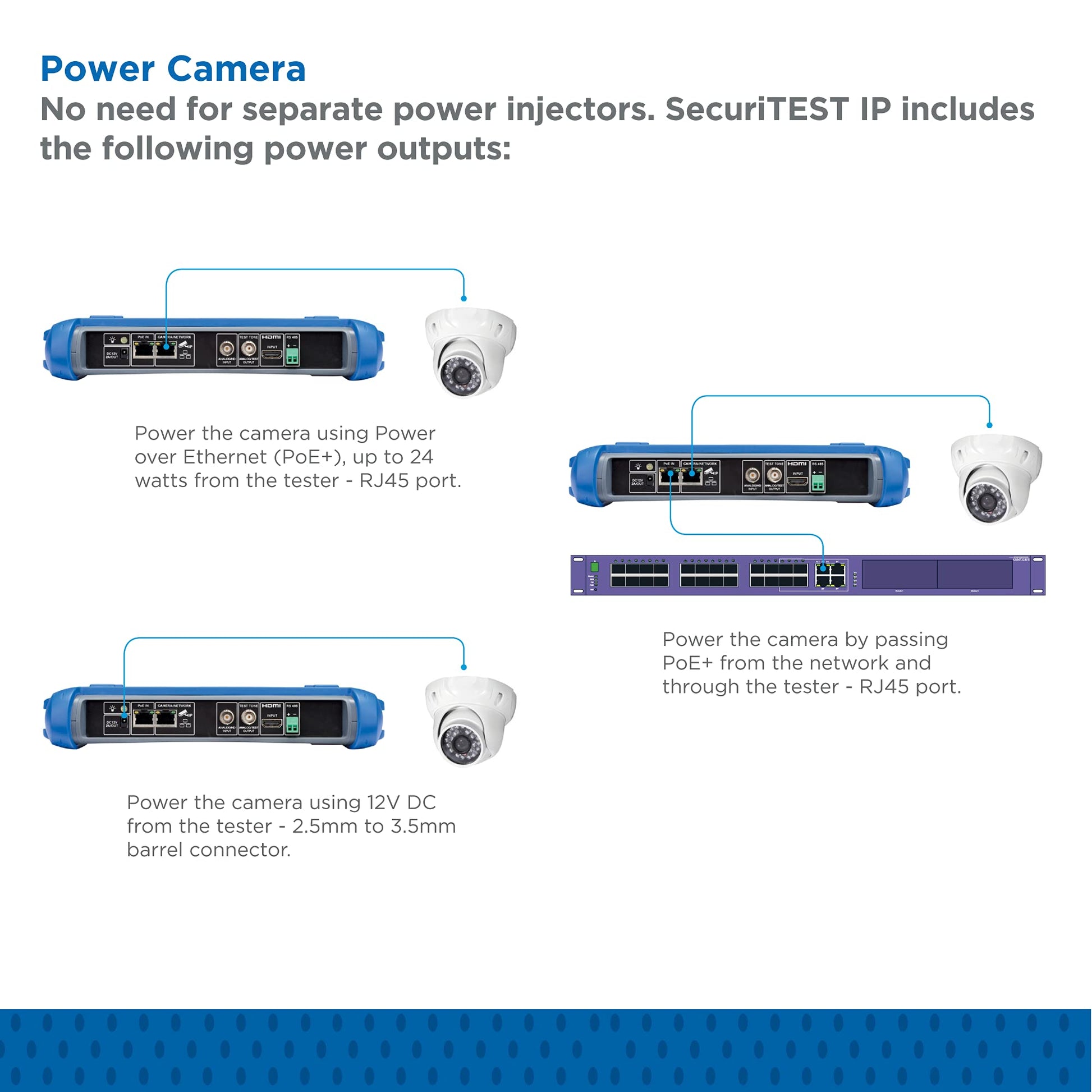 - POWER CAMERA: SecuriTEST IP supports all your power requirements for IP and analog cameras. Eliminate the need for separate power adapters and injectors by supplying power to the cameras via PoE/PoE+ or standard 12V DC power using its internal Li-Ion battery